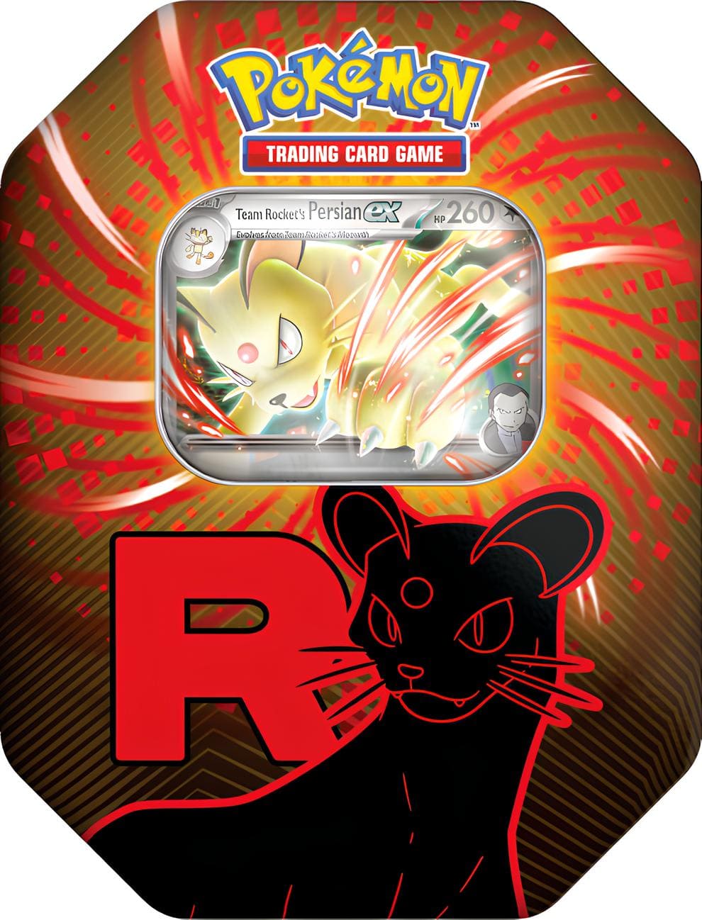 Formschöne Aufbewahrungsbox aus Metall mit Sammelkarten für deine Pokémonsammlung. Mit einer holografischen Promokarte von Team Rocket´s Mewtwo, Nidoking, Persian-ex sowie 4 Booster Packs mit je 10 Karten